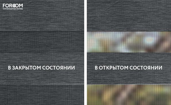 Полотно ткани, состоит из чередующихся горизонтальных полос – прозрачных и непрозрачных. Изменяя положение этих полос относительно друг другу, можно создать целых 3 режима регулировки светом. Например, чтобы в помещении стало светлее, нужно расположить прозрачные полосы друг напротив друга. Если разместить прозрачную и непрозрачную полосу параллельно друг другу, то можно добиться практически полного затемнения.